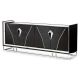 Designed for bold elegance, the Carmella Console Cabinet stuns with its shimmering black finish and captivating textures. Platinum trims frame the intricate door detailing, while a mirrored glass top and trim amplify its sleek, modern appeal. Set on a gleaming chrome base, this console offers both sophisticated style and ample storage with two cabinets, three shelving spaces, and a discreet drawer.