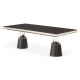 The Carmela Dining Table is a masterpiece of modern design. The smooth top in a glossy Charcoal Sand finish radiates sophistication, framed by a mirrored inlay on the apron that adds a touch of refined glamour. Supported by striking sculptural bases with gleaming silver accents, this table is a true statement piece for your dining space.