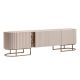 An exquisite fusion of artistry and refinement, the Lisbon Media Cabinet in Silken Cream with Bronze Accents is a true statement of sculptural sophistication. Its gracefully curved frame is cloaked in a satiny, cream-toned lacquer, brought to life with delicate reeded detailing that creates movement and rhythm. At the heart, a molten bronze inlay flows like liquid metal-an arresting focal point of artisanal depth and modern opulence. The cabinet floats atop a bronze-finished sled base, perfectly balancing warmth and structure, while the subtly reflective top adds a final note of luminosity. Behind its seamless doors, generous storage awaits, concealed within a form as poetic as it is purposeful.