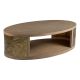An oval top and base of quartered white oak joined by elliptical end panels with inset, double-sided organic asymmetrical nature-form castings of Brazilian slate clad in bronze.