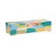 Hand painted wood box in vibrant colors with hinged lid and sleek acrylic handle with brass accents and gold triangular feet. Designed by Elaine Burge.