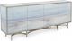 This four-door cabinet in pewter is finished with a top in clean eglomise. The glass door fronts of this piece are printed with a reproduction of Carol Benson-Cobb's painting Simpatico.