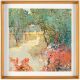 The Trail Forward by artist Liu Mengzhou is a gorgeous oil painting that depicts a serene trail surrounded by trees with both green and red leaves. The piece is hung from a pinewood frame and showcases a gold finish, providing a splash of opulence to the painting's natural themes.