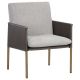 A beautiful upholstered lounge chair from our Ikon collection crafted with an intriguing mixture of textures and materials. Features a belfast grey fabric seat with a contrasting bravo ash faux leather exterior and antique brass frame. Can be paired with coordinating bench.